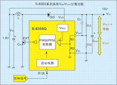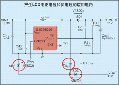圖2是產(chǎn)生LCD用正電壓和負(fù)電壓的應(yīng)用電路,它用一個(gè)升壓DC/DC變換器來產(chǎn)生正負(fù)電壓。電路中使用了VDD/VOUT分離型器件S-8356Q50,在Vout端子接口,通過使用電阻對(duì)輸出電壓進(jìn)行分壓,這樣可以調(diào)整輸出電壓。通過R1和R2正電壓可以達(dá)到很高,負(fù)電壓可以通過C1、SD3、SD2使正電壓反轉(zhuǎn)為負(fù)電壓。