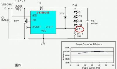 在此電路中,決定流過LED電流大小的是R1電阻。即使各個(gè)LED的Vf有所偏差,A點(diǎn)的電壓也會(huì)被控制在1.5V。因此,如果20mA的電流流過LED,電阻值則為:1.5V÷20mA=75Ω。此電路的特點(diǎn)為:因?yàn)榱鬟^LED的是穩(wěn)定的電流,所以即使LED的vf有所偏差,各個(gè)LED的亮度也會(huì)是相同的。而且,由于采用了通用DC/DC變換器,可以很簡(jiǎn)單地構(gòu)成所需電路。