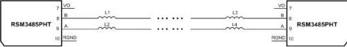 如圖 4所示的電路,兩個RSM3485PHT模塊AB接口分別串聯(lián)了磁珠,能夠達(dá)到IEC 61000-4-4 ±4kV,并能夠有效降低通信誤碼率,僅在電路中串聯(lián)了磁珠,非常的便宜有效,如果要求的EFT抗擾度等級更高,那么可以適當(dāng)增加磁珠的數(shù)量。