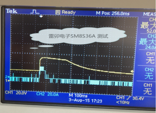 Vcl=36.5V 表示增加了TVS后端電路的電壓曲線,看得出電壓得到有效的抑制,確保后端芯片不會(huì)損壞;