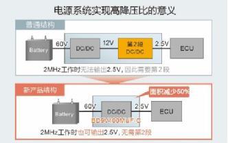 然而,車載系統(tǒng)必須保持2MHz工作,而能夠從48V直接降壓到驅(qū)動(dòng)ECU(Electronic Control Unit)所需的3.3V或5V的電源IC并不存在,需要制造12V等中間電壓,進(jìn)行2步降壓。