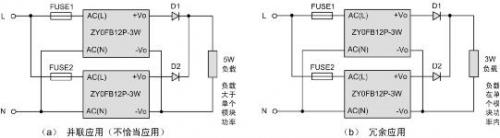 如上圖電路(a)所示,負載需5W功率,超出單個模塊的帶載能力,則其中一個模塊可能存在超負荷使用的情況。對于此種應(yīng)用,需使用單個大于5W功率的模塊,比如ZY0JGB12P-10W。而電路(b)則不然,每個模塊的功率均能滿足負載的需要,此時屬于冗余設(shè)計。