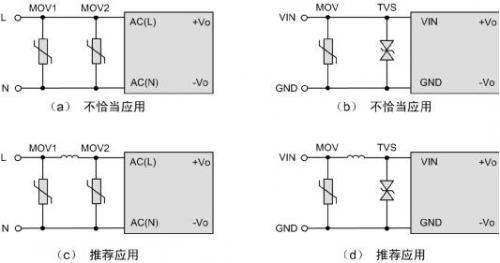 電源模塊體積小,在EMC要求比較高的場合,需要增加額外的浪涌防護電路,以提升系統(tǒng)EMC性能。如圖1所示,為提高輸入級的浪涌防護能力,在外圍增加了壓敏電阻和TVS管。但圖中的電路(a)、(b)原目的是想實現(xiàn)兩級防護,但可能適得其反。如果(a)中MOV2的壓敏電壓和通流能力比MOV1低,在強干擾場合,MOV2可能無法承受浪涌沖擊而提前損壞,導(dǎo)致整個系統(tǒng)癱瘓。同樣的,電路(b),由于TVS響應(yīng)速度比MOV快,往往是MOV未起作用,而TVS過早損壞。