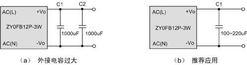 如圖2中的電路(a)所示,一個3W的模塊,輸出使用了2000uF的電容,而通過查閱產(chǎn)品手冊了解到,模塊建議最大輸出電容為800uF。輸出電容過大可能導(dǎo)致啟動不良,而對于不帶短路保護的微功率DC-DC模塊,輸出電容過大甚至可能導(dǎo)致模塊永久損壞。