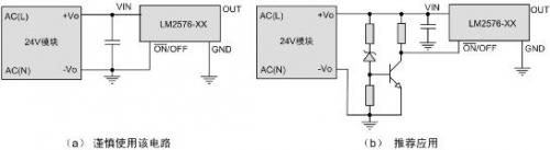 因此推薦使用電路(b),外置簡單的欠壓鎖定,使24V模塊輸出電壓建立到預(yù)置值后再啟動LM2576等外接開關(guān)電源芯片,可以很大程度上避免啟動不良問題。