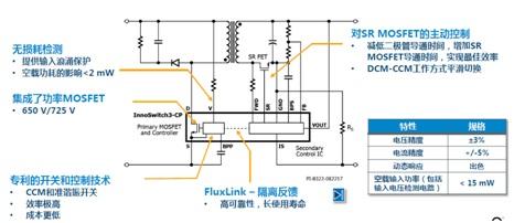 開關(guān)電源分為隔離與非隔離兩種形式,對于中小功率的應(yīng)用,常用的隔離電源拓?fù)浣Y(jié)構(gòu)有正激式和反激式。反激式指在變壓器原邊功率開關(guān)管導(dǎo)通時副邊整流管截止,變壓器儲能。原邊開關(guān)管截止時,副邊整流管開始導(dǎo)通,能量釋放到負(fù)載,周而復(fù)始的開關(guān)工作。反激式電源結(jié)構(gòu)簡單,省掉了一個和變壓器體積大小差不多的電感,因此在中小功率電源中得到廣泛的應(yīng)用。從控制方式來看,InnoSwitch3系列產(chǎn)品初次級之間采用數(shù)字反饋的FluxLink技術(shù)進行反饋信息的傳輸,對初次級的開關(guān)實現(xiàn)精確的時序控制,可以實現(xiàn)非常高的效率,同時其動態(tài)響應(yīng)特性極佳,而且輸出紋波很小。其次級檢測輸出電壓電流的控制方式使得該系列產(chǎn)品可以輸出高達65W的輸出功率,如果采用前級的功率因素校正電路,甚至可以輸出100W的輸出功率。。
