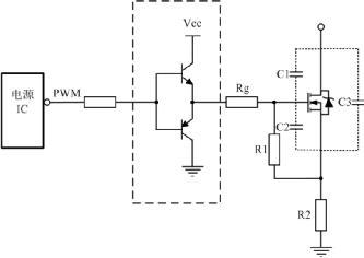 如果選擇MOS管寄生電容比較大,電源IC內(nèi)部的驅(qū)動能力又不足時,需要在驅(qū)動電路上增強驅(qū)動能力,常使用圖騰柱電路增加電源IC驅(qū)動能力,其電路如圖 2虛線框所示。